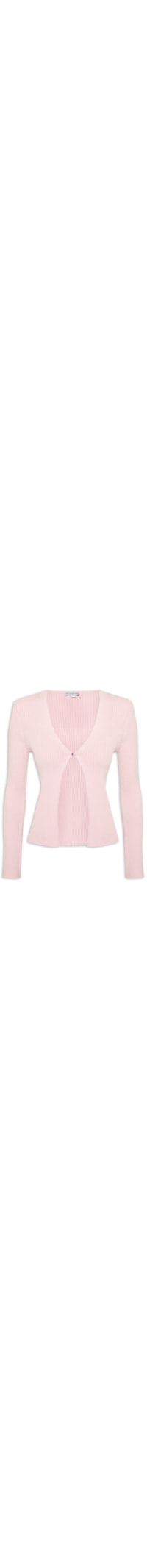 O cardigan rosa é confeccionada em tricot com superfície canelada com alta elasticidade. A peça solta ao corpo possui decote V, mangas longas, tag da marca aplicada em metal na parte posterior e fechamento frontal por colchetes.