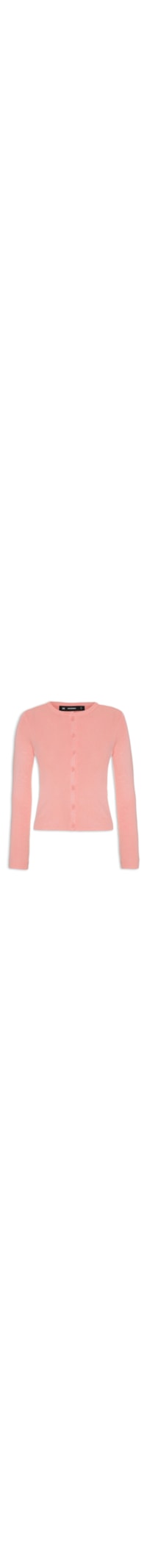 O cardigan rosa é confeccionado em malha. A peça possui decote redondo, mangas longas, shape solto e fechamento frontal por botões.