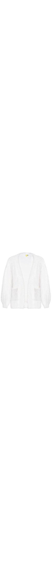 O cardigan branco é confeccionado em tricot com superfície com pelos e baixa elasticidade. A peça solta ao corpo possui abertura frontal, mangas longas com ajuste nos punhos, bolsos frontais embutidos e comprimento alongado.