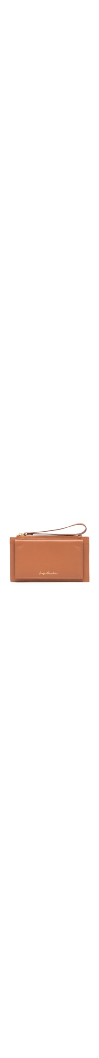 A carteira marrom é produzida em couro com superfície texturizada. A peça possui tamanho médio, formato retangular, aba sobreposta com nome da marca e fechamento frontal por botão de pressão, três divisórias de porta-cartão, forro e fechamento superior por zíper com puxador em alça de couro fina.
