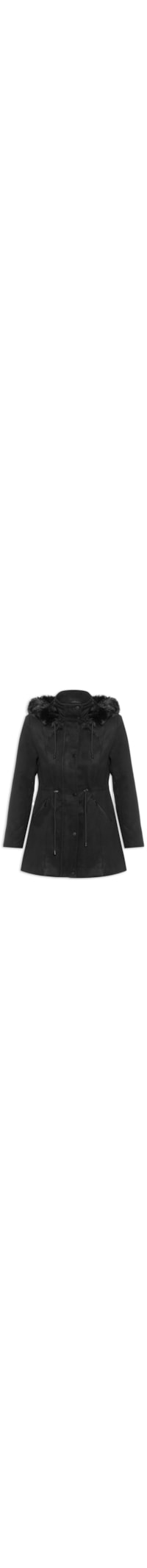 O casaco preto é confeccionado em tecido encorpado com superfície texturizada e sem elasticidade. A peça solta ao corpo possui gola alta, capuz com aplicação de pelúcia e removível por zíper, ombreiras embutidas, mangas longas, recortes frontais e posteriores, cordão alongado embutido na altura da cintura com enforcador para ajuste, bolsos frontais com fechamento em zíper, forro em pelúcia, comprimento alongado e fechamento frontal em zíper com vista sobreposta de fechamento em botões de pressão.
