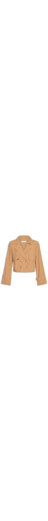 O casaco bege é confeccionado em tecido leve sem elasticidade. A peça solta ao corpo possui lapela chanfrada, mangas longas de modelo raglan com passantes e faixa com abotoamento aplicados nos punhos, aplicação de tecido sobreposto na parte frontal e posterior na área do busto, dois bolsos frontais embutidos, comprimento *cropped, forro e fechamento frontal por abotoamento.