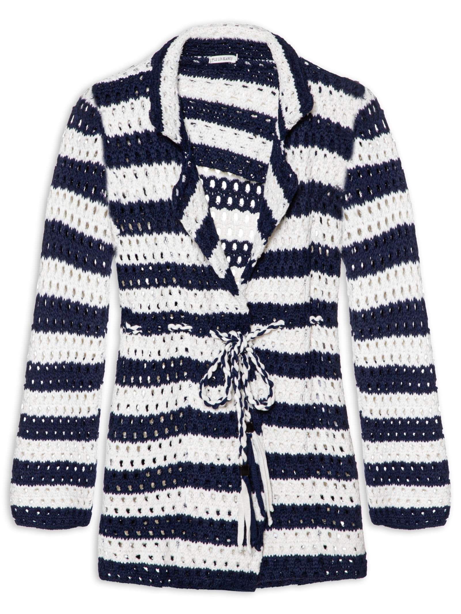 O casaco azul marinho é confeccionado em malha de tricot sem elasticidade. A peça solta ao corpo possui lapela chanfrada, mangas longas, cordão de mesma cor entrelaçado na altura da cintura para uso opcional, padronagem de listras em cor contrastante branco e comprimento alongado,