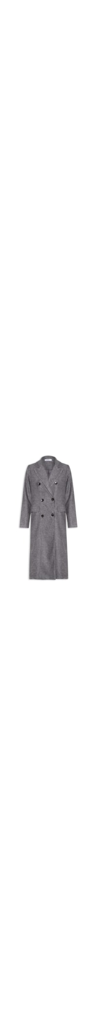 O casaco cinza é confeccionado em tecido encorpado sem elasticidade. A peça possui gola chanfrada, mangas longas com botões no punho, bolsos frontais com fechamento por lapela, recorte e fenda posterior, comprimento alongado, forro e fechamento frontal por botões.
