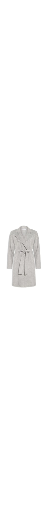 O casaco cinza é confeccionada em tecido encorpado sem elasticidade. A peça solta ao corpo possui lapela chanfrada, mangas longas, bolsos frontais embutidos, passantes aplicados na cintura, e fechamento frontal por botões. Acompanha faixa de espessura media, da mesma cor e tecido para uso opcional.