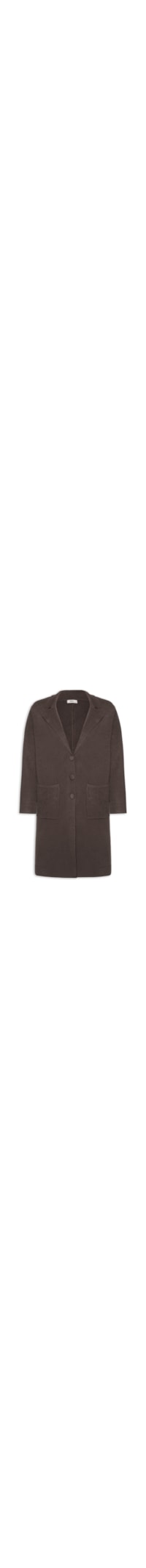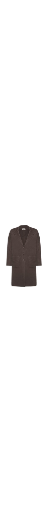 O casaco marrom é confeccionado em tricot com média elasticidade. A peça solta ao corpo possui gola com lapela estilo blazer, mangas longas com acabamento canelado, ombros levemente deslocados e comprimento alongado, bolsos frontais aplicados com acabamento canelado, fenda frontal e fechamento frontal por botões forrados no mesmo tom.