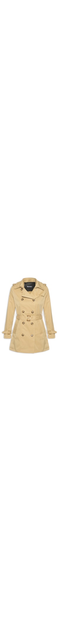 O casaco bege é confeccionado em tecido plano de poliéster sem elasticidade. A peça possui decote transpassado com gola ampla e lapela, mangas longas com passantes para faixa, ombros com passantes e botões decorativos, caimento acinturado, bolsos frontais embutidos, recortes estruturais e pespontos aparentes, barra reta com comprimento alongado, forro interno e fechamento frontal por botões duplos e cinto do mesmo tecido com fivela para ajuste.