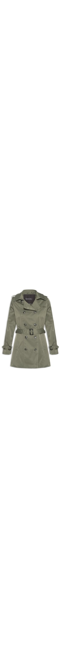 O casaco verde é confeccionado em tecido plano de poliéster sem elasticidade. A peça possui decote transpassado com gola ampla e lapela, mangas longas com passantes para faixa, ombros com passantes e botões decorativos, caimento acinturado, bolsos frontais embutidos, recortes estruturais e pespontos aparentes, barra reta com comprimento alongado, forro interno e fechamento frontal por botões duplos e cinto do mesmo tecido com fivela para ajuste.