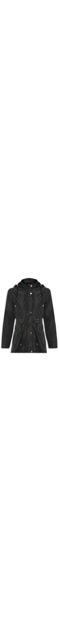 O casaco preto é confeccionado em tactel sem elasticidade. A peça solta ao corpo possui capuz removível com fechamento por zíper, mangas longas, cordão embutido no capuz e na altura da cintura para ajuste frontal com detalhes metálicos nas ponteiras, recorte posterior, bolsos frontais embutidos com fechamento por zíper e detalhe de vista sobreposta com botão aplicado, forro em pelúcia, comprimento alongado e fechamento frontal por zíper e botões de pressão.