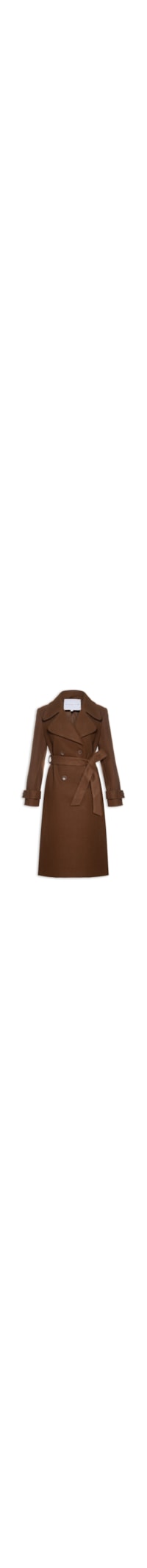 O casaco marrom é confeccionado em tecido encorpado sem elasticidade. A peça solta ao corpo possui lapela chanfrada, mangas longas com passantes e faixa aplicada nos punhos, bolsos frontais embutidos, forro, passantes aplicados nas laterais e parte posterior, comprimento alongado e fechamento frontal por botões. Acompanha cinto do mesmo tecido e espessura média para uso opcional.