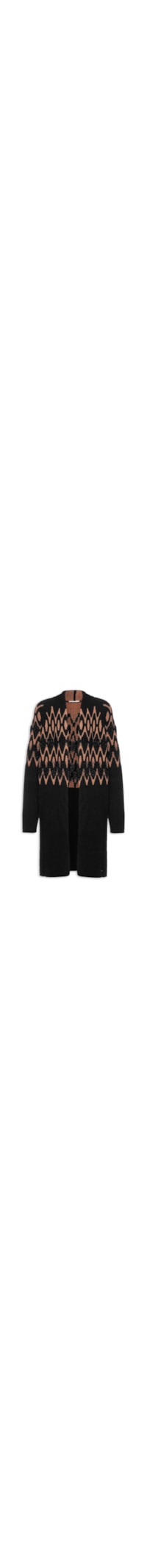 o casaco Preto é Confeccionado Em tricot De Alta Elasticidade. A Peça Solta Ao Corpo, Possui Abertura Frontal, Mangas Longas Amplas, Padronagem Geometria Com Fios De Lurex Aplicado Na Superior Frontal E Posterior Em Cocontratante, Comprimento Longo E Acabamento Canelado.