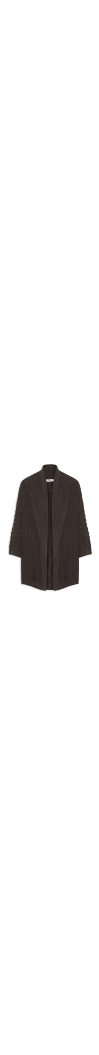 O casaco marrom é confeccionado em tricot com superfície texturizada e alta elasticidade. A peça solta ao corpo possui abertura frontal, mangas longas amplas com padronagem ondulada, tag da marca aplicada em metal na parte frontal e comprimento alongado.