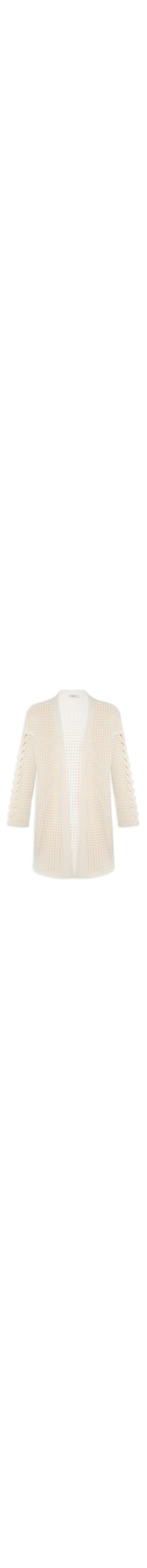 O casaco bege é confeccionado por tricot com média elasticidade. A peça possui mangas longas com recortes vazados, ombros estendidos, alta transparência e comprimento alongado.