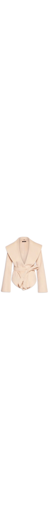 O casaco bege é confeccionado em tecido flanelado sem elasticidade. A peça solta ao corpo possui mangas longas, tecido assimétrico sobreposto na parte frontal e posterior, passantes aplicados nas laterais e comprimento cropped*. Acompanha cinto da mesma cor e tecido de espessura média para uso opcional.