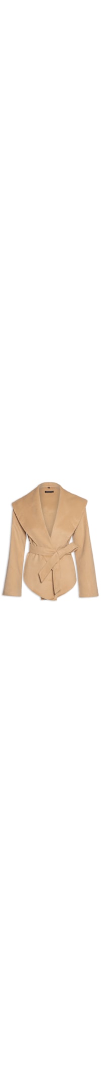 Casaco Feminino Com Amarração Frontal, Market 33. O casaco bege é confeccionado em tecido flanelado sem elasticidade. A peça solta ao corpo possui mangas longas, tecido assimétrico sobreposto na parte frontal e posterior, passantes aplicados nas laterais e comprimento cropped*. Acompanha cinto da mesma cor e tecido de espessura média para uso opcional.