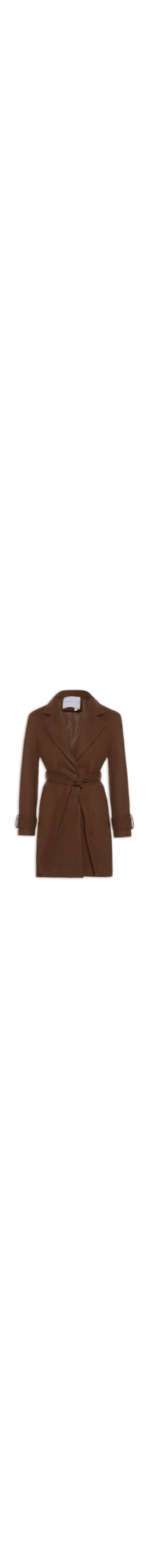 O casaco marrom é confeccionado em tecido encorpado com acabamento flanelado e sem elasticidade. A peça solta ao corpo possui lapela chanfrada, mangas longas com aplicação de passantes e martingale nos punhos, bolsos frontais, passantes aplicados na altura da cintura, recorte na parte posterior, forro e fechamento frontal por botões. Acompanha faixa do mesmo material e cor para uso opcional.