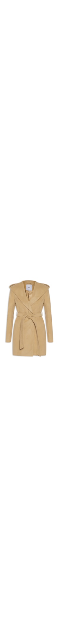 O casaco bege é confeccionado em tecido leve com superfície texturizada sem elasticidade. A peça solta ao corpo possui lapela maxi, mangas longas, forro, capuz, recorte posterior, passantes aplicados nas partes laterais na altura da cintura, comprimento alongado e não possui fechamento. Acompanha cinto para uso opcional no mesmo tecido e cor e com espessura média.