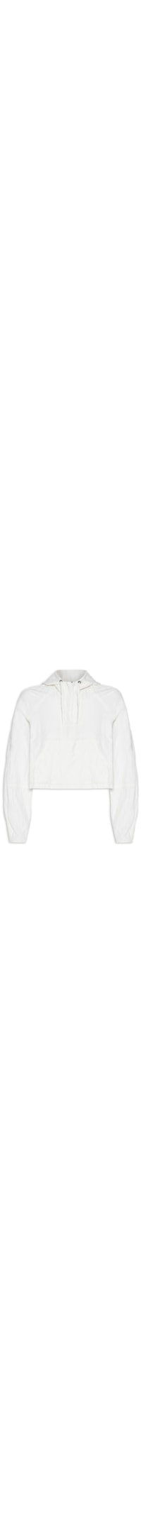O casaco off white é confeccionado em tecido leve sem elasticidade. A peça solta ao corpo possui capuz com cordão embutido, mangas longas modelo raglan, recortes na parte posterior e nas mangas, bolso frontal modelo canguru, comprimento cropped* e fechamento frontal por zíper.