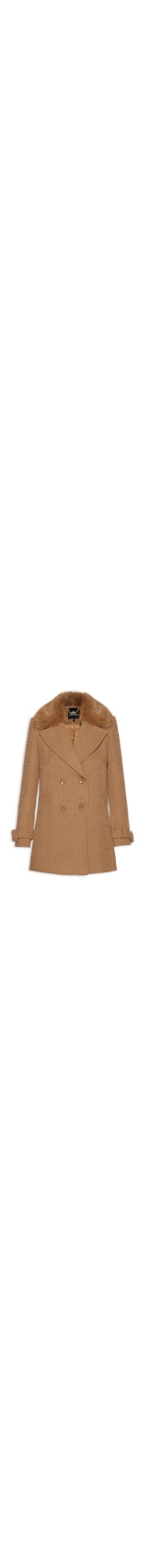 O casaco marrom é confeccionado em tweed sem elasticidade. A peça solta ao corpo possui lapela chanfrada com sobreposição de colarinho removível em pelúcia, mangas longas com passantes e faixas médias removíveis e reguláveis por fivela metálica, recorte posterior, forro, bolsos frontais embutidos, comprimento alongado, transpasse na parte frontal e fechamento frontal por botões.