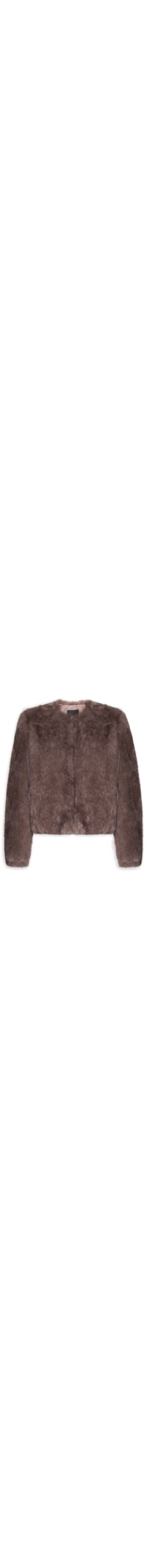 O casaco marrom é confeccionado em tecido leve com superfície em pelúcia sem elasticidade. A peça solta ao corpo possui decote redondo, ombros estendidos, mangas longas, bolsos frontais embutidos, forro e fechamento frontal por colchete.