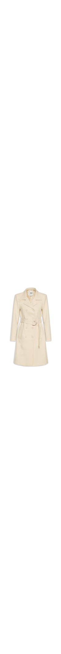 O casaco bege é confeccionado em tecido leve sem elasticidade. A peça solta ao corpo possui lapela chanfrada maxi, mangas longas com abotoamento nos punhos, ombreiras embutidas, recorte posterior, passantes laterais na altura da cintura, bolsos frontais embutidos, forro, comprimento alongado e fechamento frontal por botões. Acompanha faixa de mesmo tecido com fivela metálica para ajuste e uso opcional.