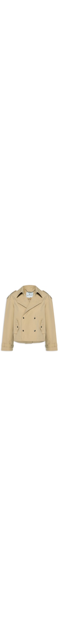 O casaco bege é confeccionado por tecido leve sem elasticidade. A peça solta ao corpo possui maxi lapela chanfrada, mangas longas com passantes aplicados nos punhos tira sobreposta com fechamento por fivela para ajuste, ombros estendidos, bolsos frontais com fechamento por aba sobreposta e botão de pressão recorte frontal, recorte posterior vazado com fechamento por tira e botão, prega posterior, forro e fechamento por botão frontal.