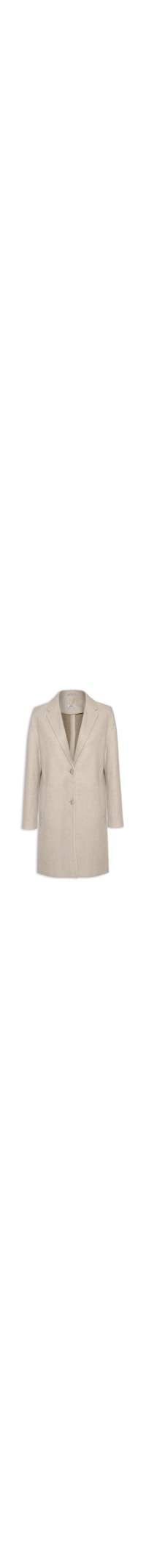 O casaco bege é confeccionado em lã sem elasticidade. A peça solta ao corpo possui gola lapela simples, mangas longas, bolsos no modelo faca, recorte posterior, fenda posterior, fechamento por botões frontais e comprimento alongado.