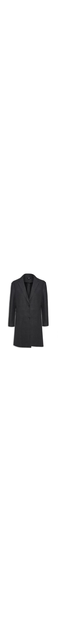 O casaco cinza é confeccionado em lã sem elasticidade. A peça solta ao corpo, mangas longas, bolsos no modelo faca, recorte posterior, fenda posterior, fechamento por botões frontais e comprimento alongado.