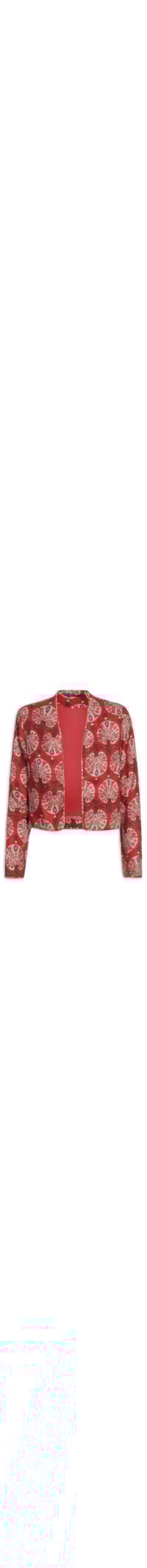 O casaco vermelho é confeccionado em linho sem elasticidade. A peça solta ao corpo possui ombreiras embutidas, mangas longas, mix de estampas em cores contrastantes, leve transparência, forro, acabamento com viés acolchoado e detalhe em fios de lurex, comprimento cropped* e sem fechamento.