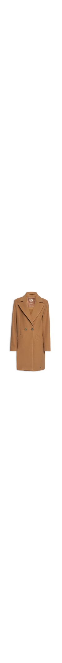 O casaco marrom é confeccionado em tecido encorpado com superfície texturizada e sem elasticidade. A peça solta ao corpo possui lapela chanfrada, mangas longas, recorte posterior, pences frontais, bolsos frontais embutidos, forro, comprimento alongado e fechamento frontal por botões.