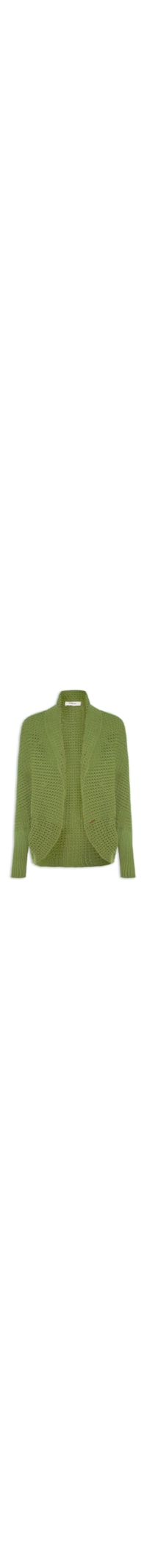 O casaco verde é confeccionado em tricot com alta elasticidade. A peça solta ao corpo possui lapela xale, mangas longas de modelo morcego com acabamento canelado, tag metalizada da marca aplicada na parte frontal, barra mullet*, trama com recortes vazados e comprimento alongado.