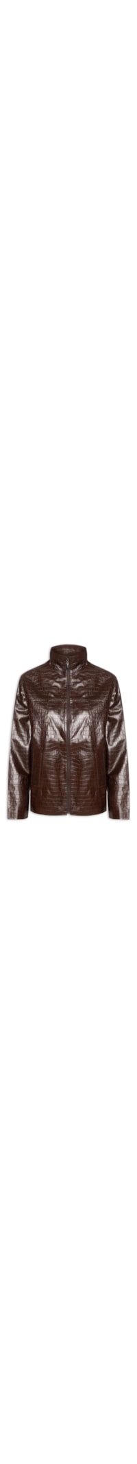 O casaco marrom é confeccionado em couro com textura croco e acabamento levemente acetinado. A peça possui modelagem reta e levemente ampla, gola alta estruturada, mangas longas, bolsos frontais funcionais, forro e fechamento frontal por zíper.