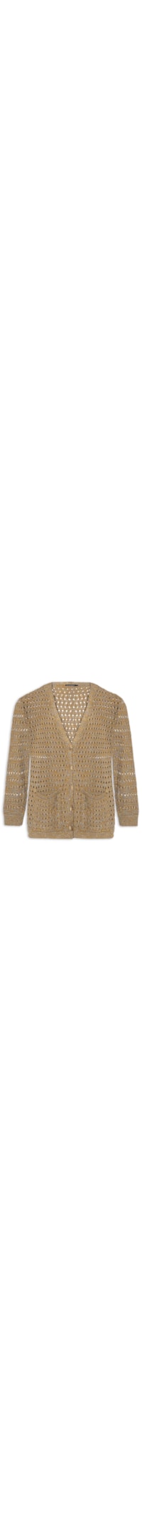 O casaco marrom é confeccionado em tricot com fios de lurex e baixa elasticidade. A peça solta ao corpo possui decote V profundo com acabamento canelado, mangas longas amplas com punhos canelados, ombros levemente deslocados, trama vazada em padronagem geométrica, bolsos frontais embutidos, barra com acabamento canelado e fechamento frontal por botões.
