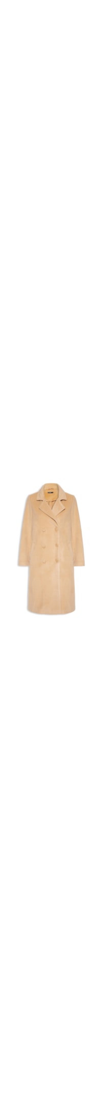 O casaco bege é confeccionado em tecido encorpado. A peça possui lapela chanfrada, mangas longas, bolsos frontais, forro em cor contrastante, comprimento alongado, shape solto, caimento reto, acabamento pespontado e fechamento frontal por botões.