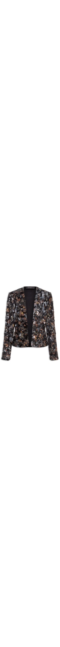 O casaco preto é confeccionada em tecido leve com superfície em paetê sem elasticidade. A peça solta ao corpo possui decote V, mangas longas, forro e fechamento frontal por colchetes.
