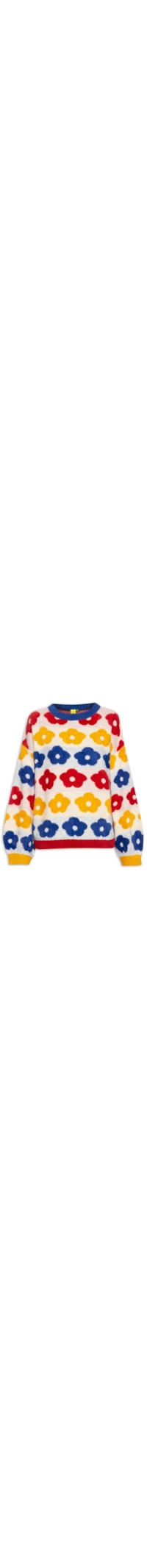 O casaco branco é confeccionado em tricot encorpado com superfície com pelo e alta elasticidade. A peça de modelo oversized* possui decote redondo, mangas longas bufantes, ombros estendidos e padronagem floral em cores contrastantes.