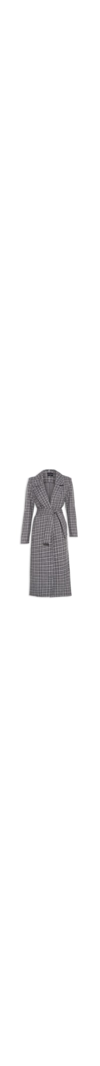 O casaco cinza é confeccionado em tecido encorpado com superfície texturizada e sem elasticidade. A peça solta ao corpo possui lapela chanfrada, mangas longas, bolsos laterais embutidos, padronagem xadrez em tons contrastantes, comprimento alongado e sem fechamento. Acompanha tira alongada da mesma cor e tecido para amarração opcional.