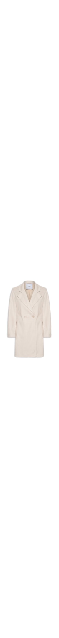 O casaco bege é confeccionado em tecido encorpado sem elasticidade. A peça solta ao corpo possui lapela chanfrada, mangas longas com ajuste nos punhos, bolsos frontais embutidos, padronagem chevron em cor contrastante, forro e fechamento frontal por botões.