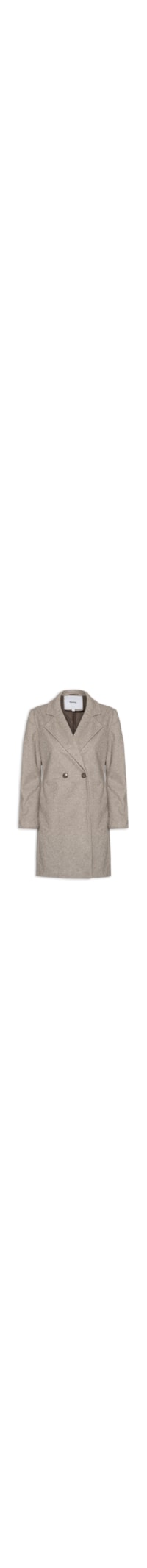 O casaco marrom é confeccionado em tecido encorpado sem elasticidade. A peça solta ao corpo possui lapela chanfrada, mangas longas com ajuste nos punhos, bolsos frontais embutidos, padronagem chevron em cor contrastante, forro e fechamento frontal por botões.