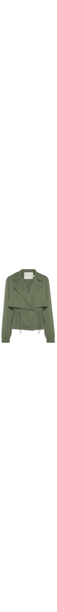 O casaco verde é confeccionado em tecido leve sem elasticidade. A peça solta ao corpo, possui lapela chanfrada, mangas longas com elástico embutido nos punhos, recortes frontais e posterior sobrepostos, cordão elástico embutido na cintura com enforcadores para regulagem, prega posterior, e fechamento frontal por botões.