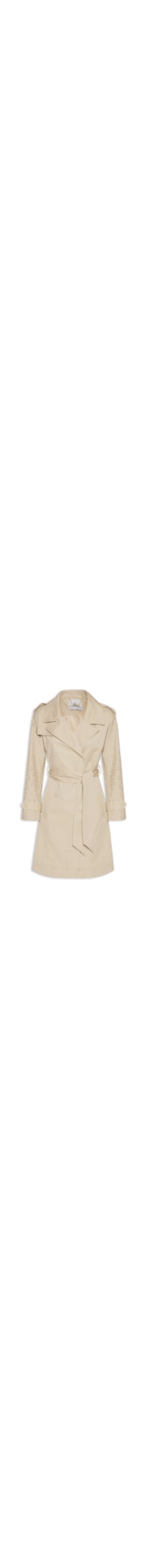 O casaco bege é confeccionado em tecido leve sem elasticidade. A peça solta ao corpo de modelo trench coat possui lapela maxi, mangas longas em laise e com martingale, recorte posterior com fenda, recorte posterior em lastex, passantes laterais na altura da cintura, sobreposição frontal, bolsos frontais embutidos, forro, comprimento alongado e fechamento frontal por botões.