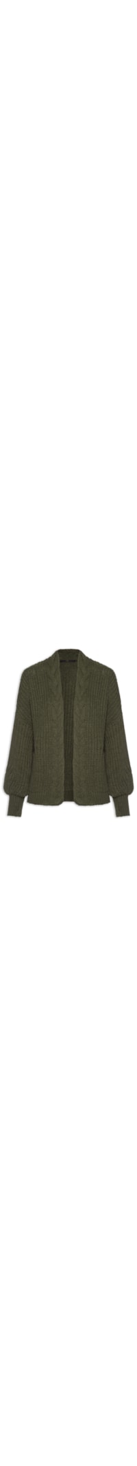 O casaco verde é confeccionado em tricot com baixa elasticidade. A peça solta ao corpo possui ombros estendidos, mangas longas, tramado frontal trançado, comprimento alongado e acabamento canelado.
