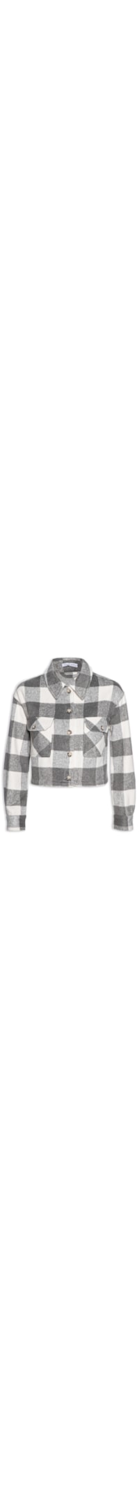 O casaco cinza é confeccionado por lã batida sem elasticidade. A peça solta ao corpo possui colarinho simples, mangas longas com ajuste nos punhos por botão, ombros estendidos, bolsos frontais com fechamento por botão e aba sobreposta, fendas laterais, recorte posterior, padronagem xadrez em cor contrastante, fechamento por botão frontal e comprimento cropped*.