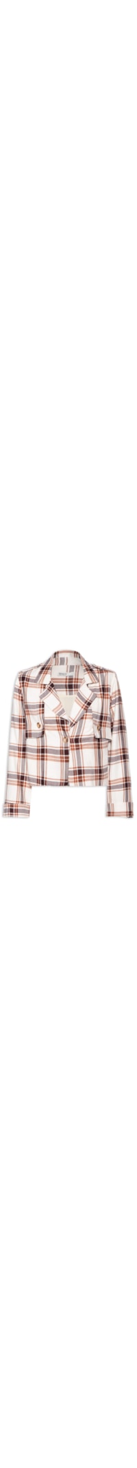 O casaco bege é confeccionado em tecido leve sem elasticidade. A peça solta ao corpo possui lapela chanfrada, mangas longas com abotoamento nos punhos, sobreposição posterior e frontal com detalhe de botões, martingales na altura dos ombros, forro, padronagem xadrez em cores contrastantes, comprimento cropped* e fechamento frontal por botão.