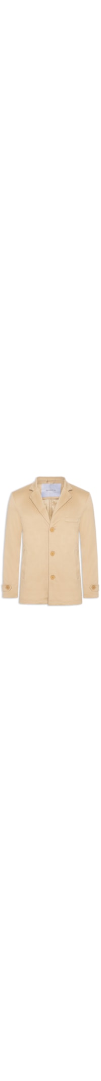 O casaco bege é confeccionado em tecido plano sem elasticidade. A peça solta ao corpo possui gola com lapela, mangas longas com ajuste nos punhos por tira com botão, ombros estruturados, caimento reto, bolso embutido na altura do tórax e bolsos frontais embutidos, barra reta, forro interno acolchoado com acabamento pespontado e fechamento frontal por botões.