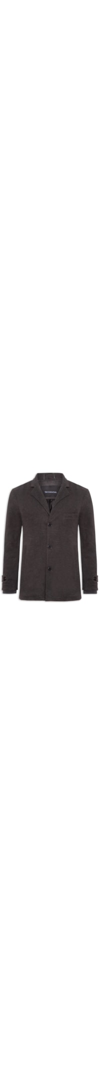 O casaco cinza é confeccionado em tecido plano sem elasticidade. A peça solta ao corpo possui gola com lapela, mangas longas com ajuste nos punhos por tira com botão, ombros estruturados, caimento reto, bolso embutido na altura do tórax e bolsos frontais embutidos, barra reta, forro interno acolchoado com acabamento pespontado e fechamento frontal por botões.