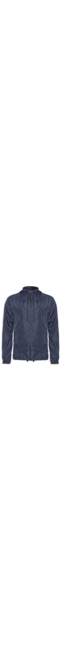O casaco azul é confeccionado em tactel sem elasticidade. A peça solta ao corpo possui capuz com tiras alongadas embutidas para ajuste e amarração, mangas longas com elástico embutido nos punhos, bolsos frontais embutidos, barra com tira elástica embutida com enforcador frontal para ajuste, forro em mesh e fechamento frontal em zíper.