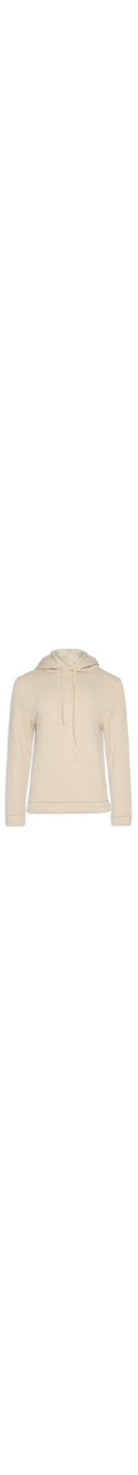 O casaco bege é confeccionado em tricot com média elasticidade. A peça solta ao corpo possui capuz com cordão embutido para ajuste, mangas longas e parte interna forrada em felpa.