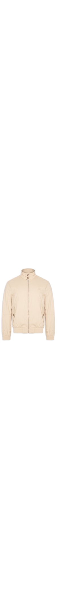 O casaco bege é confeccionado em tecido encorpado sem elasticidade. A peça solta ao corpo possui gola alta, mangas longas com elástico embutido nos punhos, bolsos frontais embutidos com aba sobreposta e fechamento por botão, bolso interno embutido com fechamento por botão zíper, forro, elástico embutido na barra, logo da marca bordado na parte frontal na altura do tórax e fechamento frontal por zíper e botões na gola.