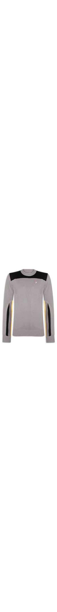 O casaco cinza é confeccionado em tricot sem elasticidade. A peça justa ao corpo possui gola alta com acabamento canelado, mangas longas, recortes frontais e posteriores em cores contrastantes cinza e amarelo e logo da marca bordado na parte frontal na altura do tórax.